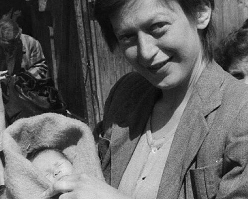 Image still from a reel by the U.S. Army Signal Corps of Anka Nathanová and her newborn daughter, Eva Clark at Mauthausen concentration camp.